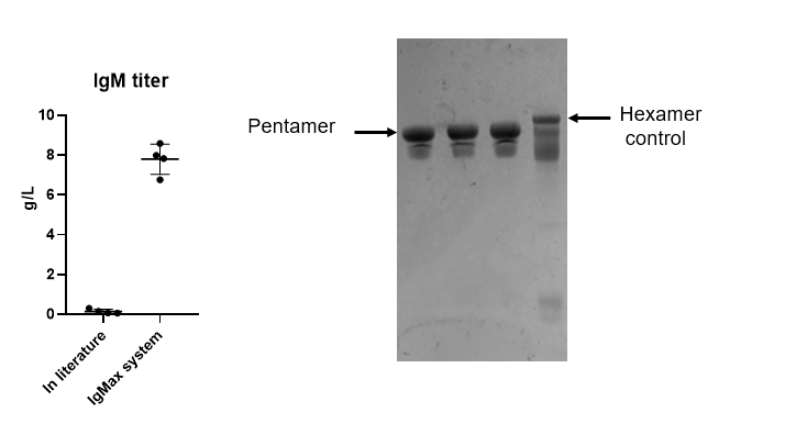 在細胞株構(gòu)建階段,漢騰生物研發(fā)團隊選擇了具有最高穩(wěn)定性和特定生產(chǎn)力的CHO細胞系作為最終的先導(dǎo)克隆,并且通過調(diào)節(jié)載體比例改變產(chǎn)生的抗體滴度。漢騰生物IgMaxTM表達載體平臺最高可以達到8g/L的產(chǎn)量,并且IgM構(gòu)型均一,其中,五聚體比例接近100%,幾乎無六聚體產(chǎn)生(IgM有五聚體和六聚體形式,包含開放J鏈的五聚體形式是開發(fā)和生產(chǎn)IgM的目標(biāo)構(gòu)型)。