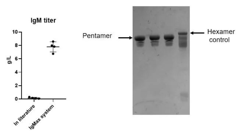 漢騰生物具備高表達(dá)IgM的經(jīng)驗(yàn),經(jīng)過(guò)載體系統(tǒng)改進(jìn)及生產(chǎn)工藝的優(yōu)化后可提高lgM表達(dá)量,最高可達(dá)8g/L。其中,IgMaxTM表達(dá)載體平臺(tái)和IgMasterTM工藝平臺(tái)是漢騰生物自主研發(fā)的IgM相關(guān)開(kāi)發(fā)平臺(tái),其具備了高產(chǎn)量、高純度和高效價(jià)的特點(diǎn),技術(shù)轉(zhuǎn)移路線清晰,可滿足大規(guī)模生產(chǎn)的需求。此外,理化分析、生化分析、制劑開(kāi)發(fā)和生產(chǎn)能力也均配套完善,可有效解決IgM的產(chǎn)業(yè)化難題。
