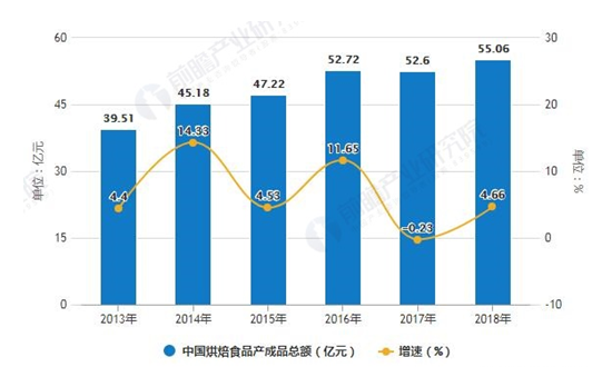 2013-2018年中國烘焙食品產(chǎn)成品總額統(tǒng)計及增長情況