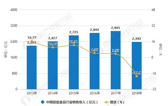 2013-2018年中國烘焙食品行業(yè)銷售收入統(tǒng)計及增長情況